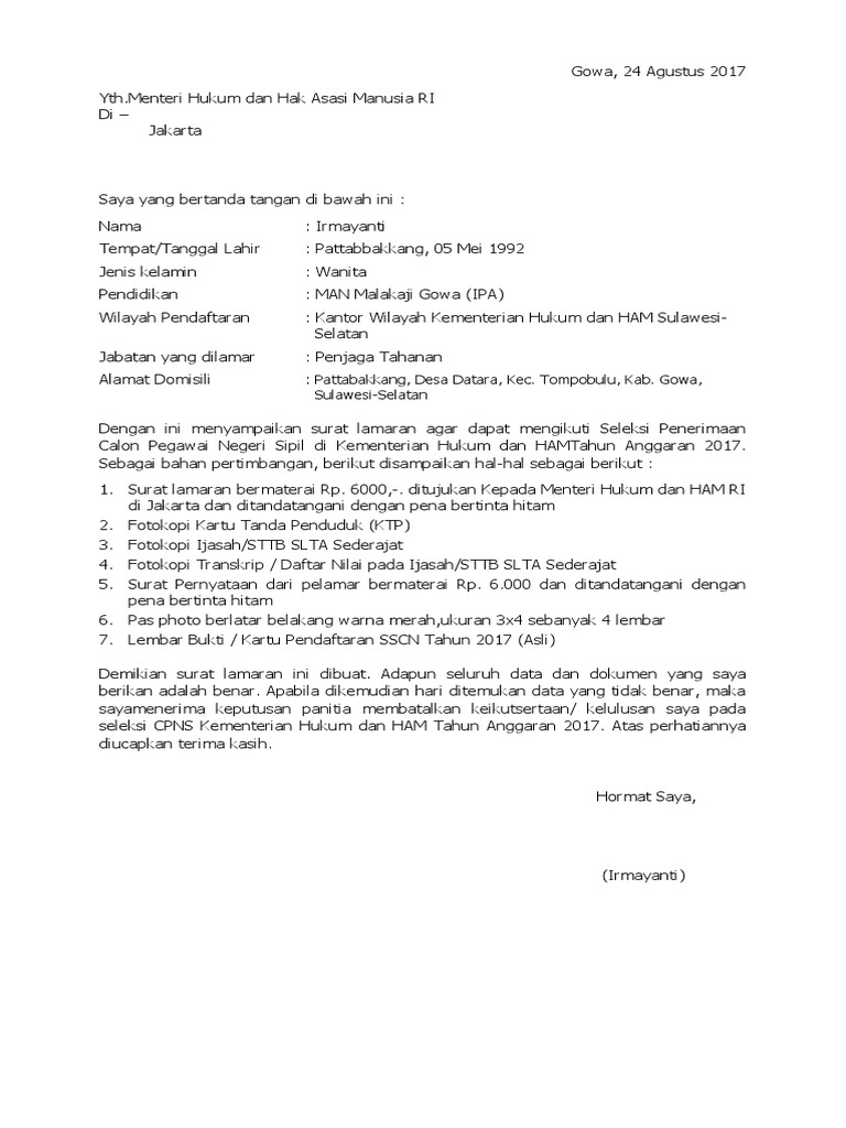 Pendaftaran cpns juga tidak terlalu susah, karena bisa dilakukan secara online. Sebenarnya contoh surat lamaran kerja cpns 2018 kementerian agama ini sudah dilampirkan dalam pengumuman pelaksanaan seleksi calon pegawai negeri sipil kementerian agama republik indonesia tahun anggaran 2018. Kantor wilayah kementerian hukum dan ham ntt jabatan yang dilamar. Contoh surat lamaran kerja umum, bank, karyawan, alfamart, pt, sekolahan, formal, fresh graduate, bahasa inggris, via email, tulis surat lamaran kerja dan lampirannya harus menjelaskan dua hal yakni, kamu siapa dan sudah berbuat apa. Bagi anda yang membutuhkan contoh surat lamaran cpns kementerian hukum dan hak asasi manusia dengan ini menyampaikan surat lamaran dan dokumen persyaratan agar dapat diterima sebagai calon pegawai negeri sipil di kementerian hukum dan ham tahun anggaran 2019.